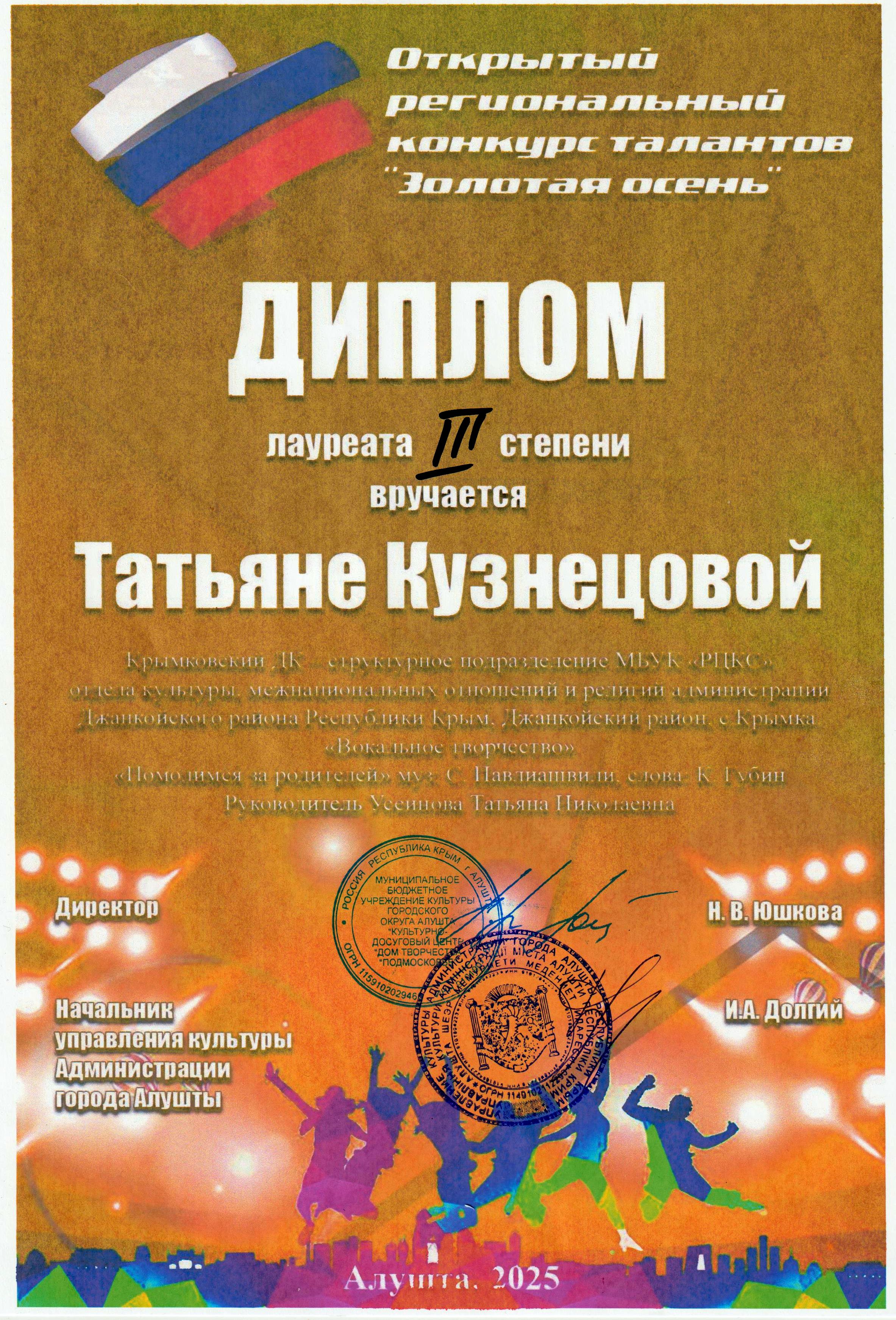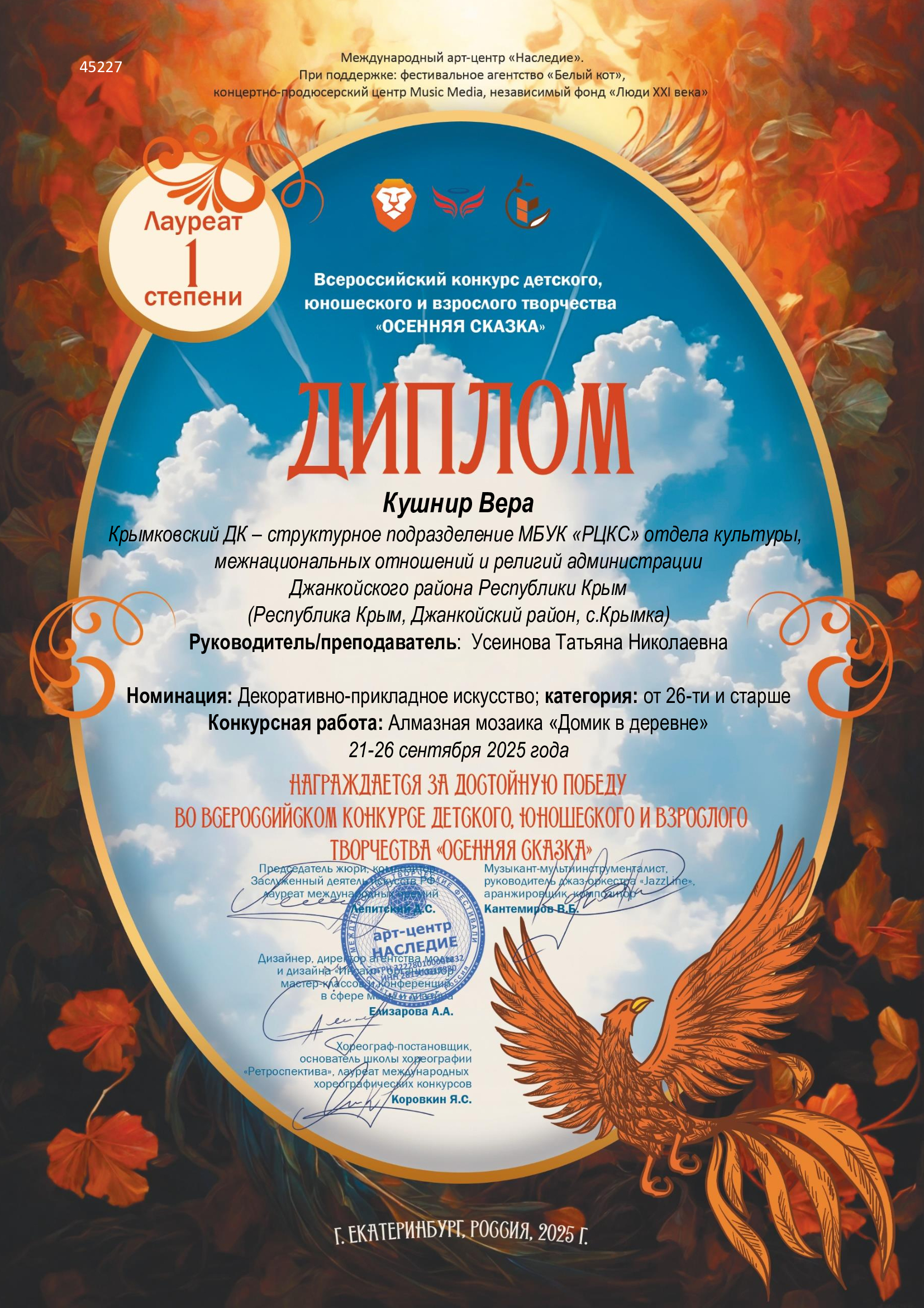 Крымский Дом культуры поздравляет участницу любительского объединения "Радуга", Кушнир Веру Яковлевну с заслуженной победой! В сентябре 2025 года в городе Екатеринбург на Всероссийском конкурсе детского, юношеского и взрослого творчества «Осенняя сказка» Вера Яковлевна стала Лауреатом 1 степени в номинации ДПИ, представив алмазную мозаику "Домик в деревне". Сегодня мы получили Диплом победителя и Благодарственное письмо для руководителя – Усеиновой Татьяны Николаевны. Поздравляем нашу победительницу и желаем ей дальнейших творческих успехов!
