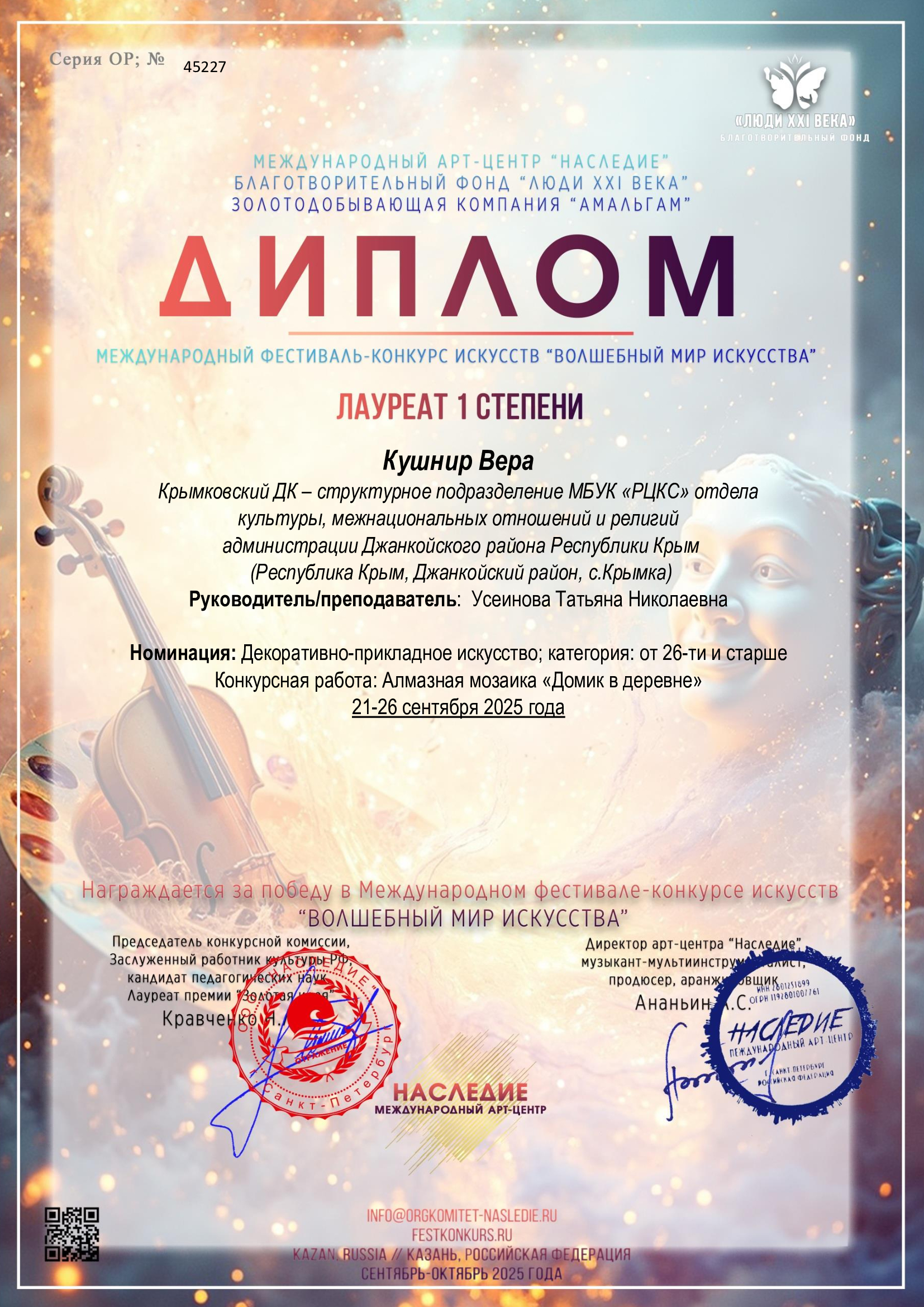 Крымский Дом культуры поздравляет участницу любительского объединения "Радуга", Кушнир Веру Яковлевну с заслуженной победой! В сентябре 2025 года в городе Казань на Международном фестивале-конкурсе искусств «Волшебный мир искусства» она стала Лауреатом 1 степени в номинации ДПИ, представив алмазную мозаику "Домик в деревне". Сегодня мы получили Диплом победителя и Благодарственное письмо для руководителя – Усеиновой Татьяны Николаевны. Поздравляем нашу победительницу и желаем ей дальнейших творческих успехов!