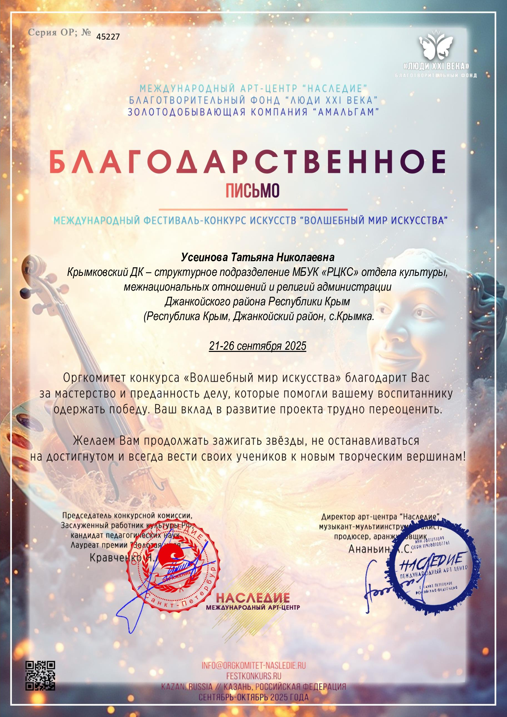 Сегодня мы получили Диплом победителя и Благодарственное письмо для руководителя – Усеиновой Татьяны Николаевны. Поздравляем нашу победительницу и желаем ей дальнейших творческих успехов!