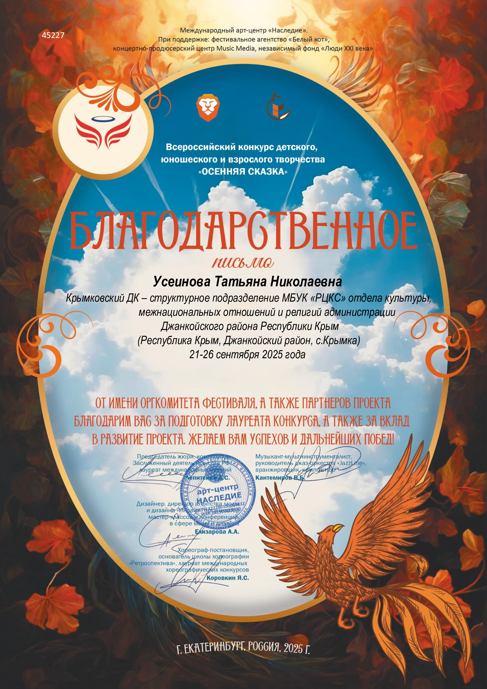 Сегодня мы получили Диплом победителя и Благодарственное письмо для руководителя – Усеиновой Татьяны Николаевны. Поздравляем нашу победительницу и желаем ей дальнейших творческих успехов!