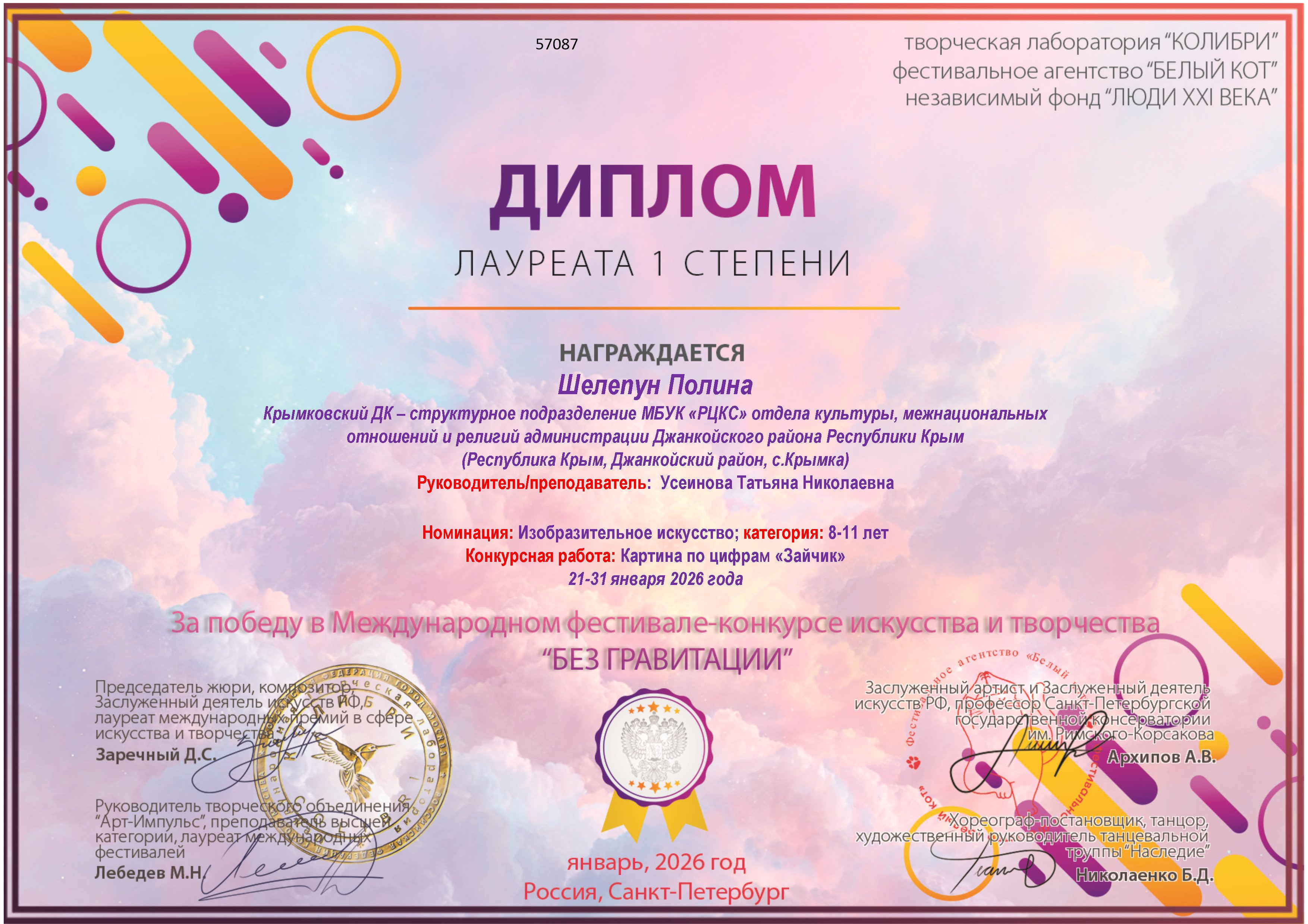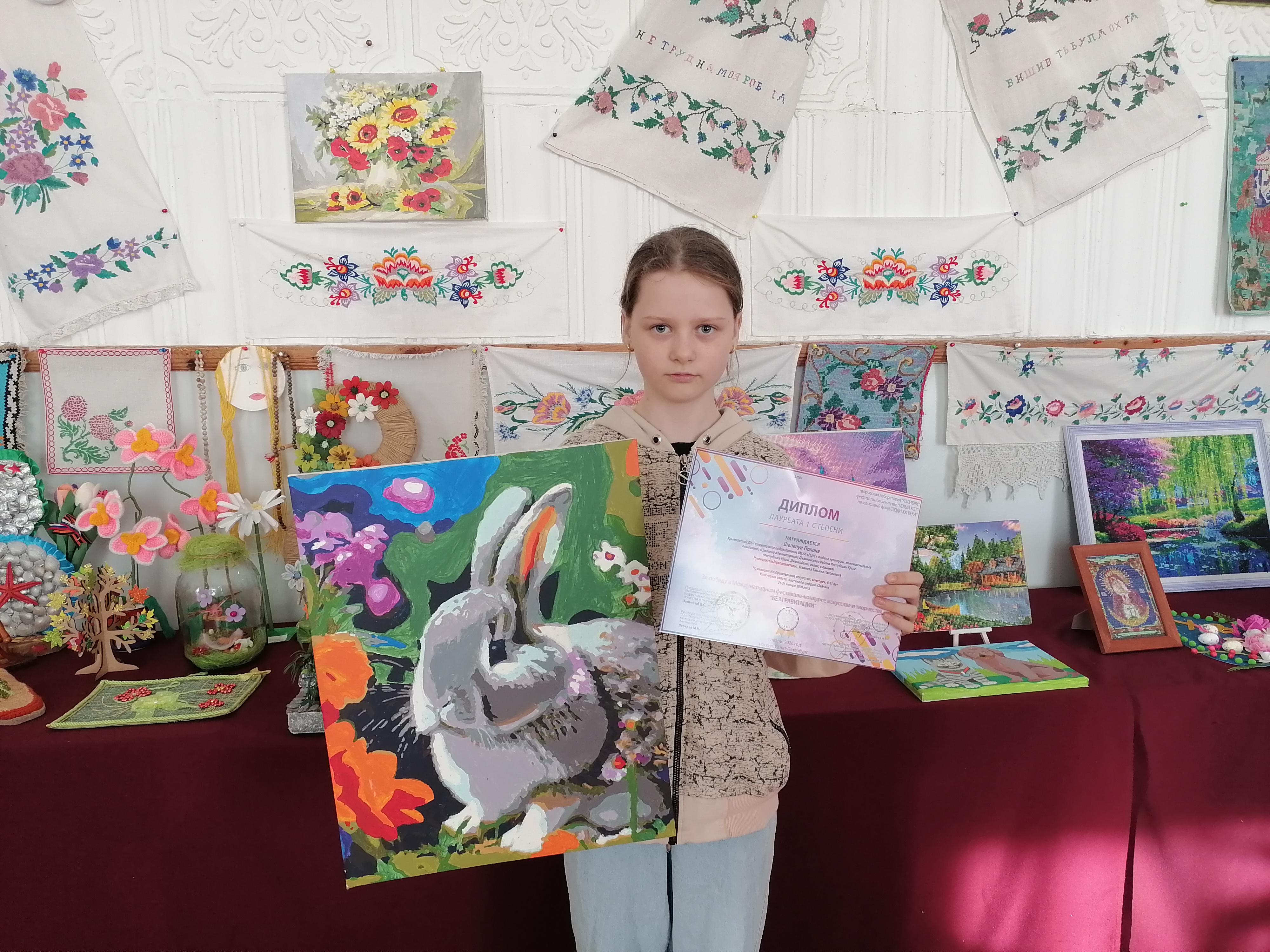 Крымковский ДК поздравляет Шелепун Полину с победным местом! В январе 2026 года в г.Санкт -Петербург, на Международном фестивале конкурсе искусства и творчества "Без гравитации", она стала Лауреатом 1 степени в номинации "ИЗО". На конкурс она представила картину по цифрам "Зайчик".