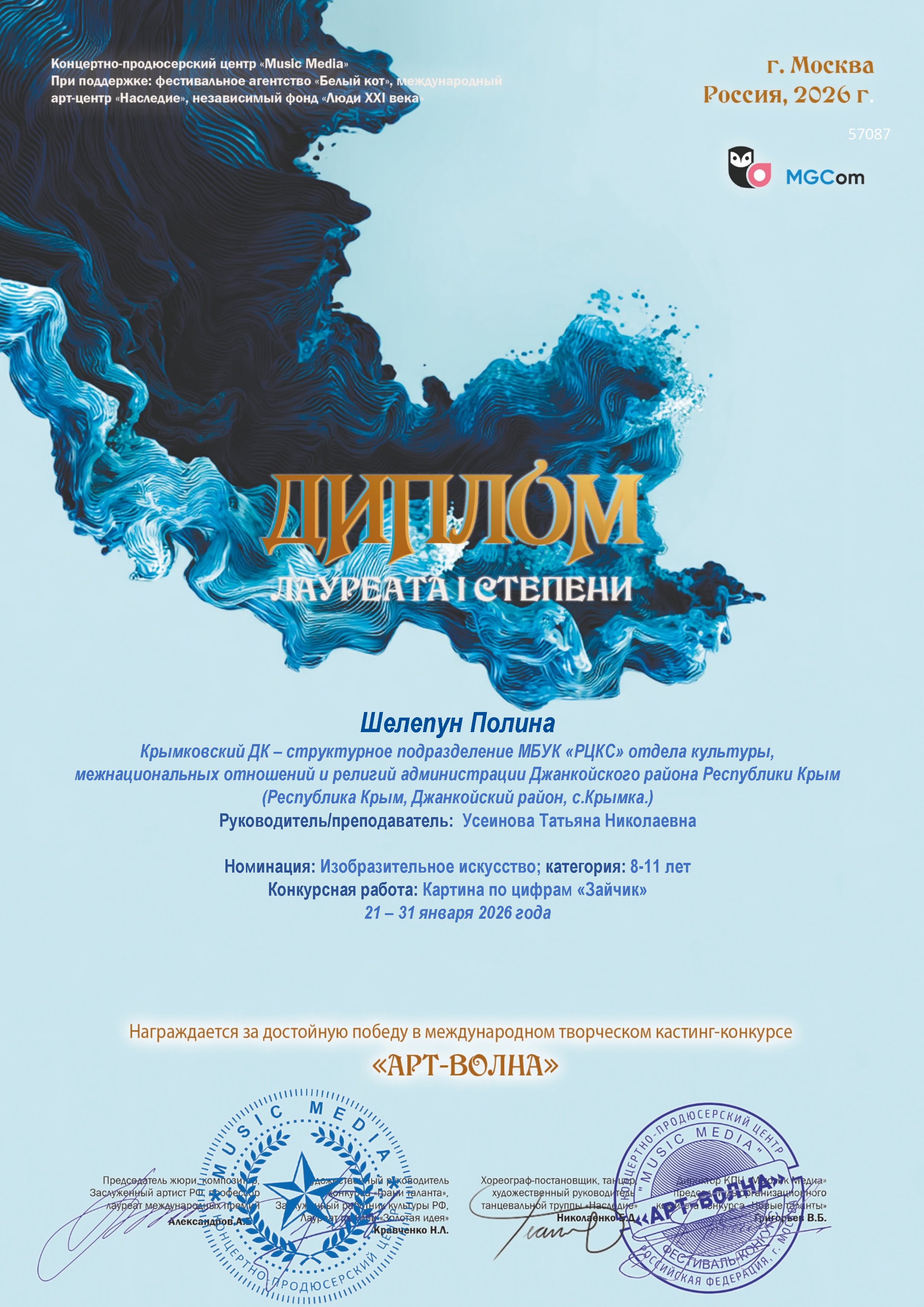 Крымковский ДК поздравляет Шелепун Полину с победным местом! В январе 2026 года в г.Москва, на Международном творческом кастинг - конкурсе "Арт Волна", она стала Лауреатом 1 степени в номинации "ИЗО". На конкурс она представила картину по цифрам "Зайчик".