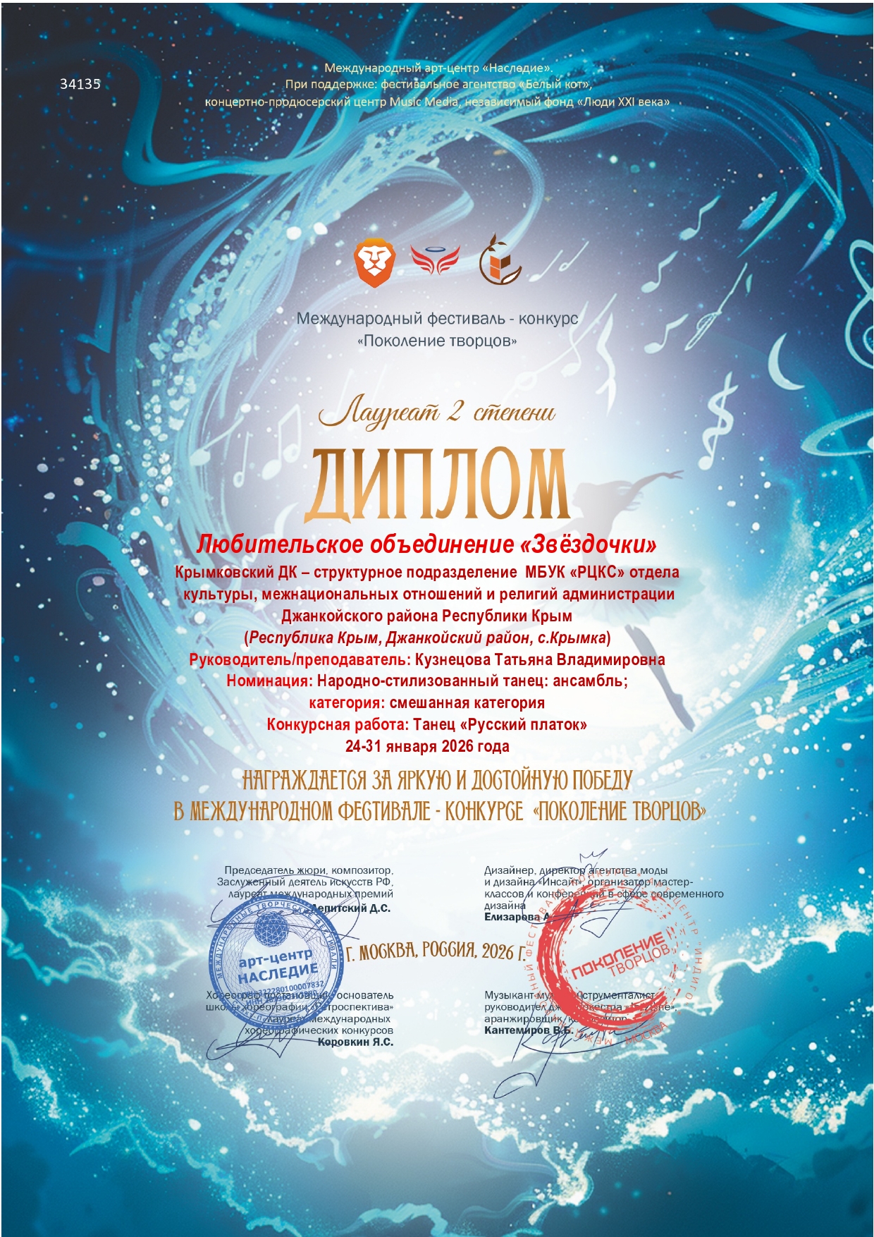 Крымковский ДК поздравляет Любительское объединение "Звёздочки" с победным местом! В январе 2026 года в г.Москва, на Международном фестивале - конкурсе "Поколение творцов", они стали Лауреатом 2 степени в номинации "Народно-стилизованный танец". На конкурс они представили танец "Русский платок".