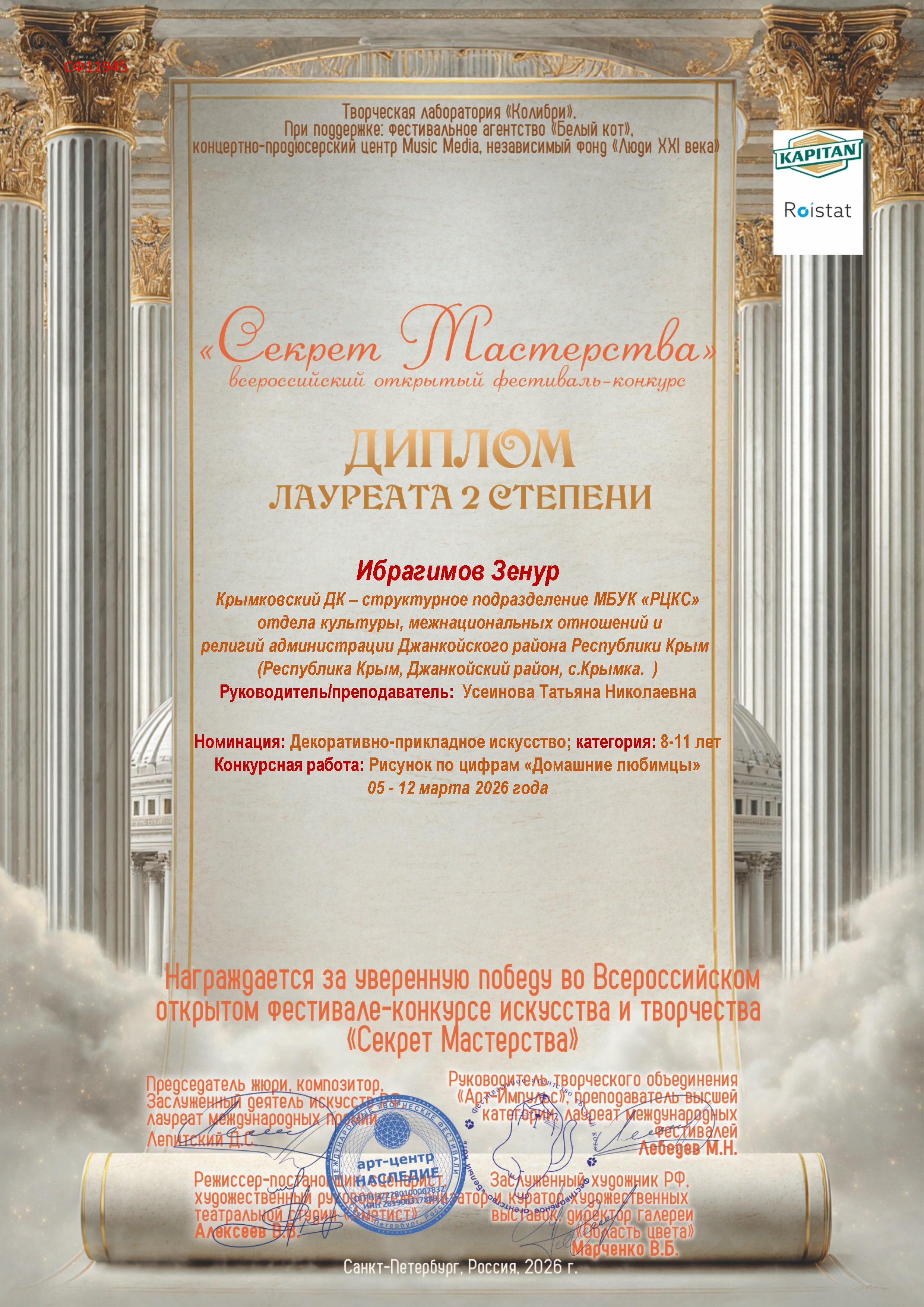 В марте 2026 года в Санкт - Петербурге, прошёл Всероссийский открытый фестиваль - конкурс "Секрет Мастерства", где Зенур представил рисунок по цифрам "Домашние любимцы". По итогам конкурса Зенур стал Лауреатом 2 степени.