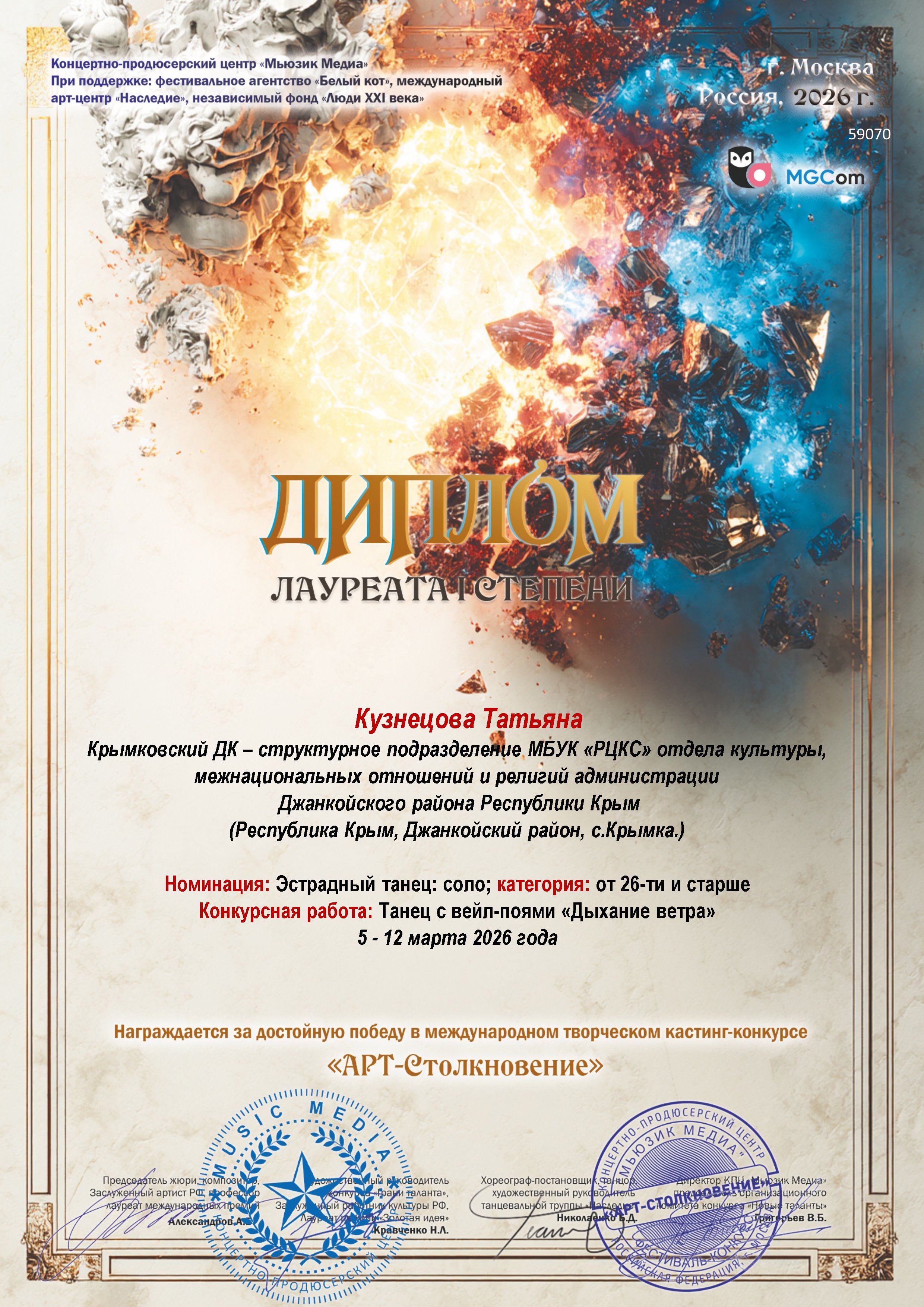 В марте 2026 года в г.Москва, на Международном творческом кастинг - конкурсе "АРТ-Столкновение", она представила танцевальную композицию с вейл-поями «Дыхание ветра» в номинации «Эстрадный танец». По итогам конкурса Татьяна стала Лауреатом 1 степени в категории - соло.