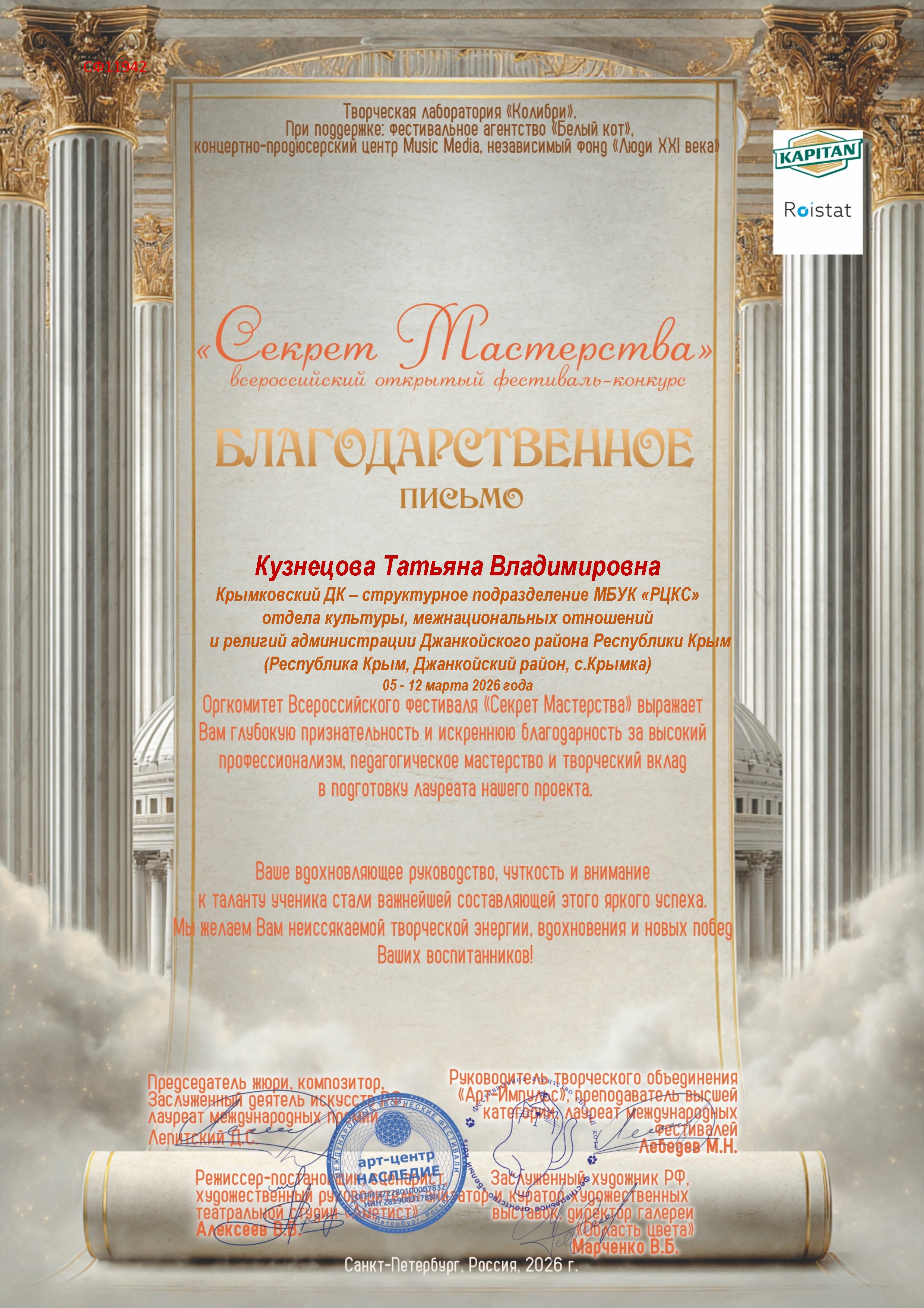 В марте 2026 года в г. Санкт-Петербург, на Всероссийсском открытом фестивале - конкурсе "Секрет Мастерства", они стали Лауреатом II степени в номинации "Народный вокал".