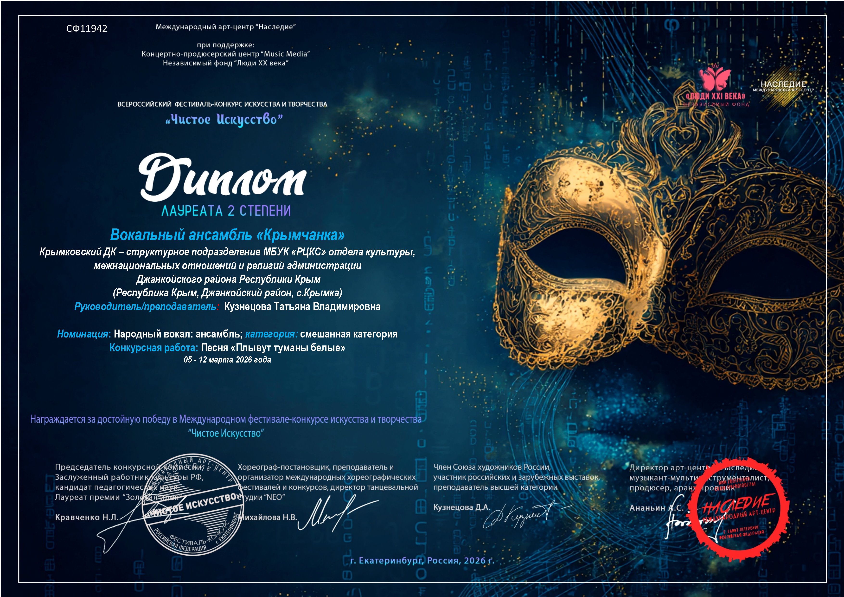 Крымковский ДК поздравляет вокальный ансмбль "Крымчанка". В марте 2026 года в г.Екатеринбург, на Всероссийском фестивале - конкурсе искусства и творчества "Чистое искусство", они представили песню "Плывут туманы белые". По итогам конкурса ансамбль стал Лауреатом 2 степени. Поздравляем участниц ансамбля с этим замечательным достижением и желаем им новых творческих успехов.